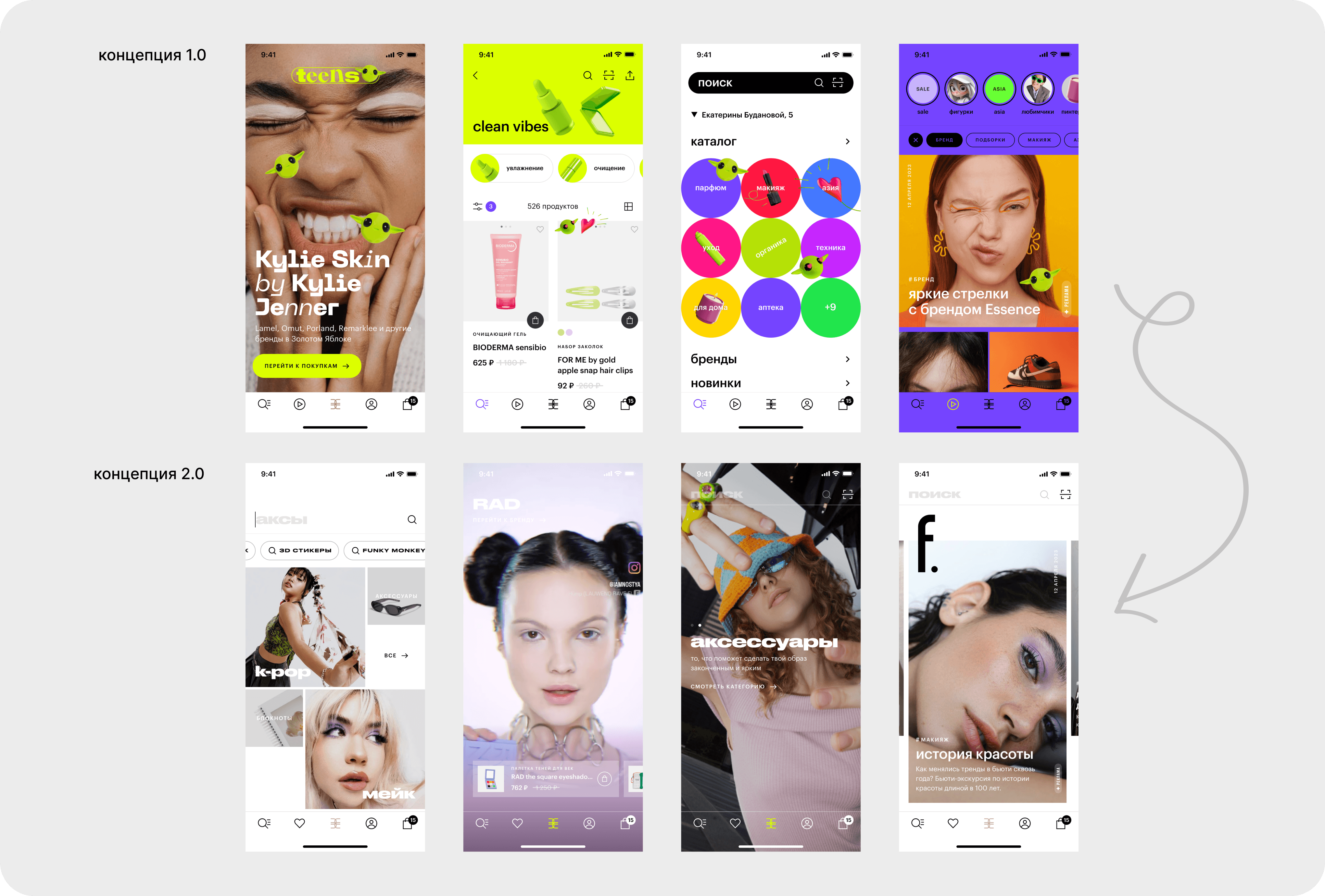 Первая концепция была очень яркой, смелой и визуально насыщенной. Она отражала стереотип: если подростки — значит яркие цвета и акцентная типографика. Но тесты сказали обратное. Подростки хотят «красиво, эстетично, нейтрально», без ощущения детского раздела. После фидбека я стала полностью переосмыслять визуальную концепцию.