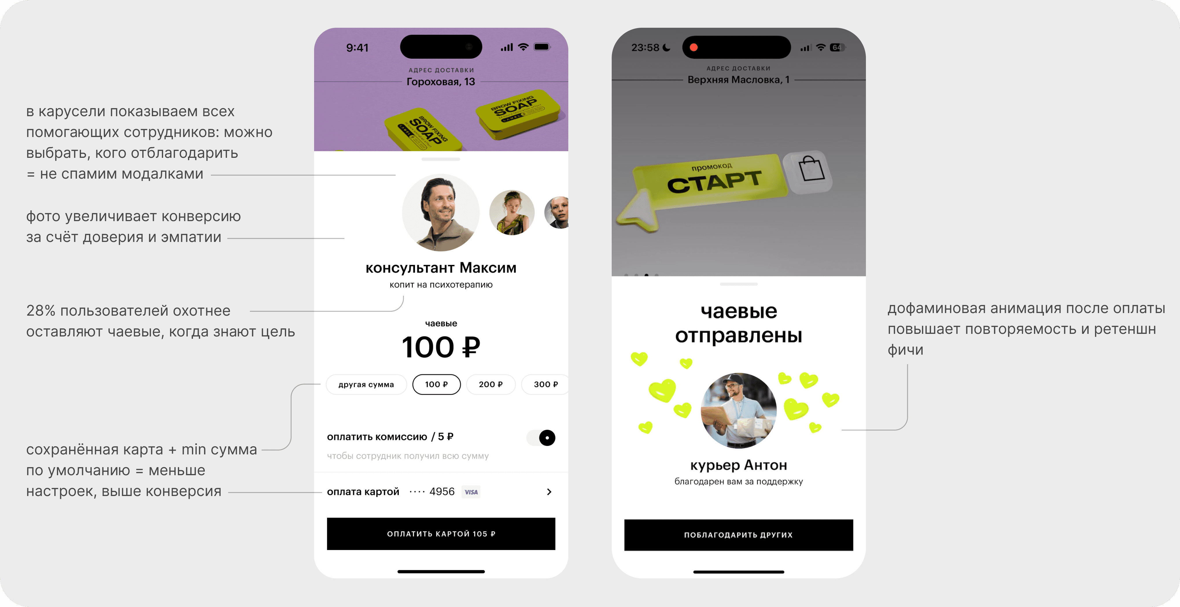 Эти данные позволили показать заказчикам, что фича чаевых закрывает потребности, а нашей команде сформулировать много новых гипотез.