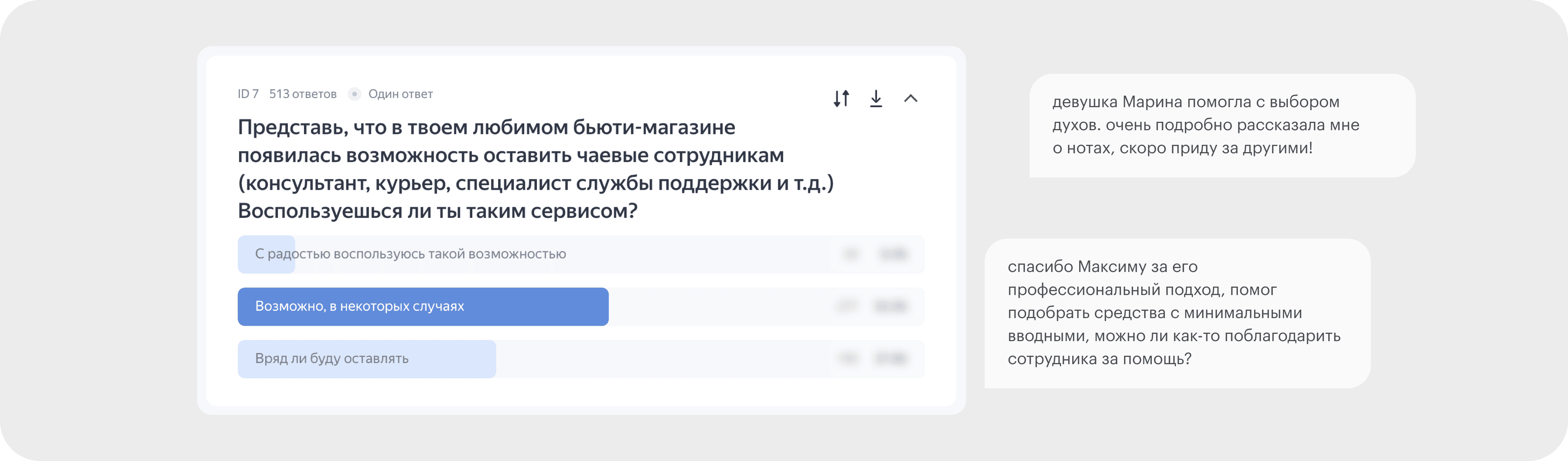 На этапе дискавери я и продакт менеджер изучили готовые исследования и решили провести собственный опрос, чтобы понять, готов ли пользователь в целом оставлять чаевые курьерам, кассирам и консультантам в сфере beauty.